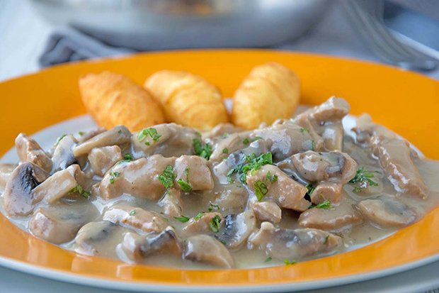 Veal cutlet, croquettes, vegetables, with mushroom cream sauce