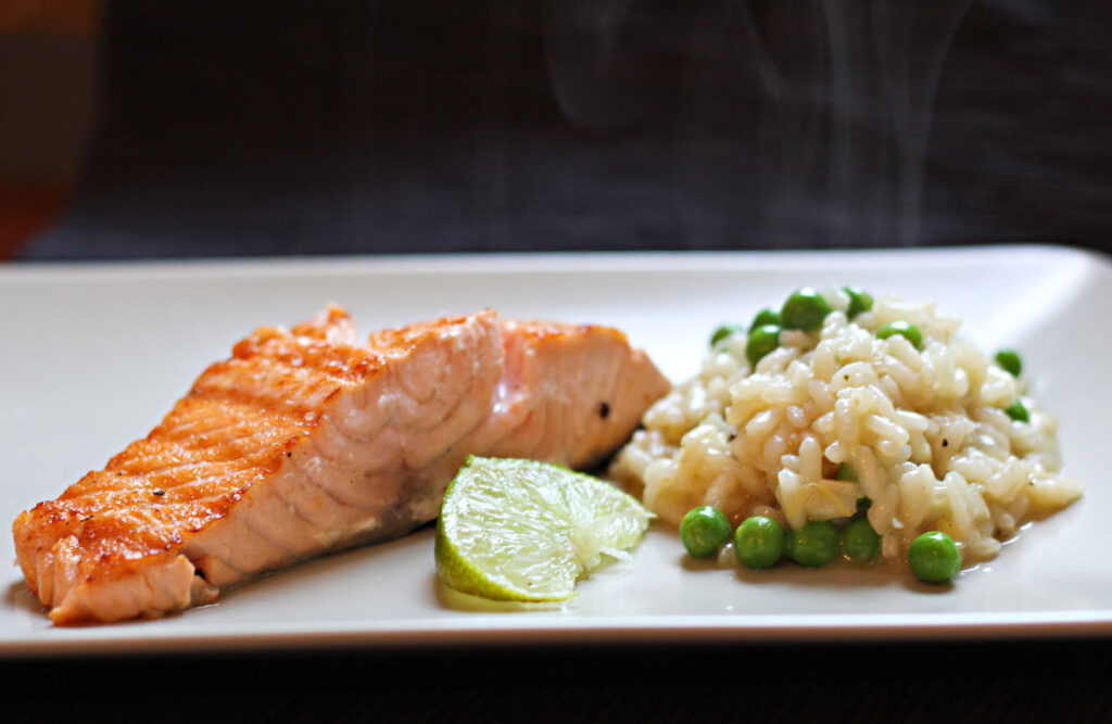 Salmon steak, vegetable risotto with lime sauce